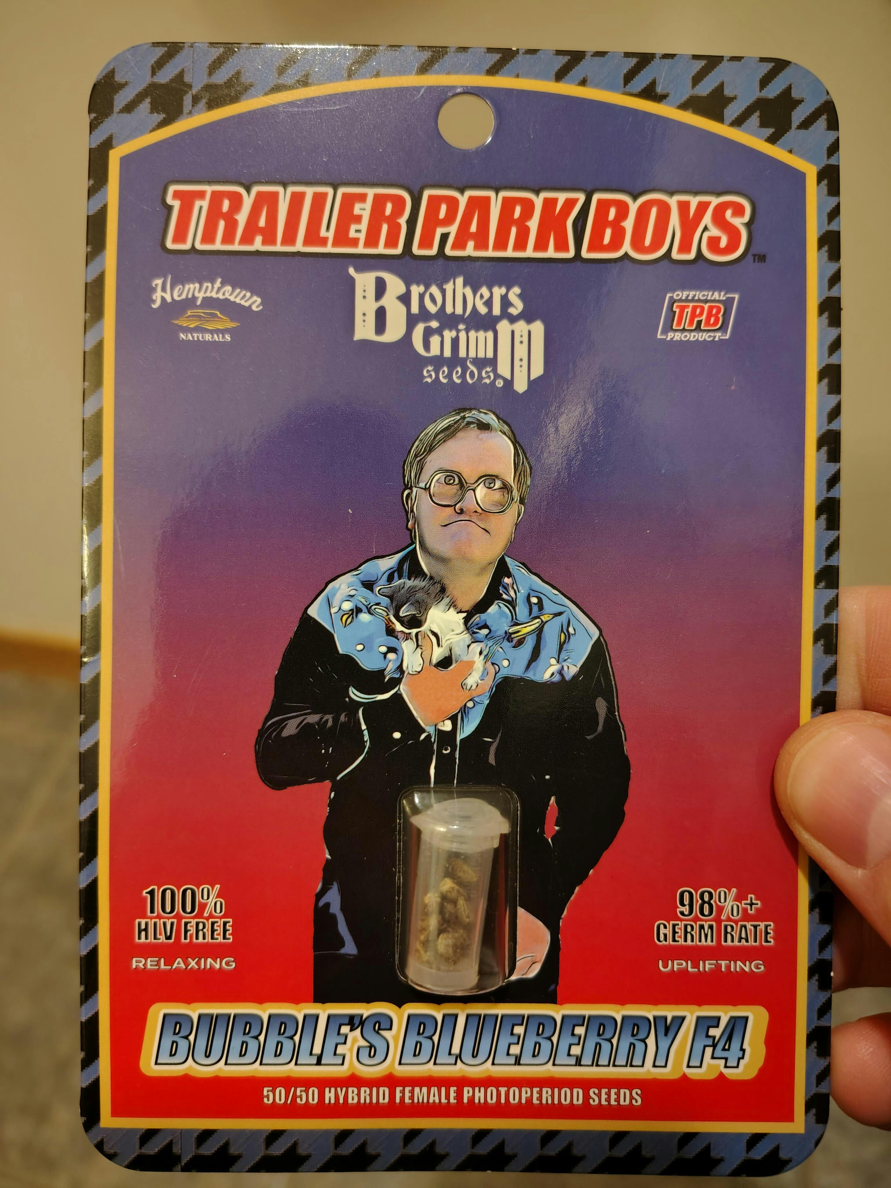 Go full kitty mode with Bubbles Blueberry F4, a sweet and soothing strain inspired by the one and only Bubbles. This here refined masterpiece smells like it’s been dunked in a big ol’ vat of glazed blueberry syrup—sticky, sweet, and downright mouthwater- in’. Whether you’re chillin’ with your kitties, fixin’ up a shopping cart, or jamming on your guitar, Bubbles Blueberry is the kind of sticky-icky that’ll make you purr with blueberry bliss. Now just grow it and let the good times roll! And for the full Trailer Park Boys experience, finish off your homegrown Bubble’s Blueberry with a Trailer Park Boys blunt wrap.